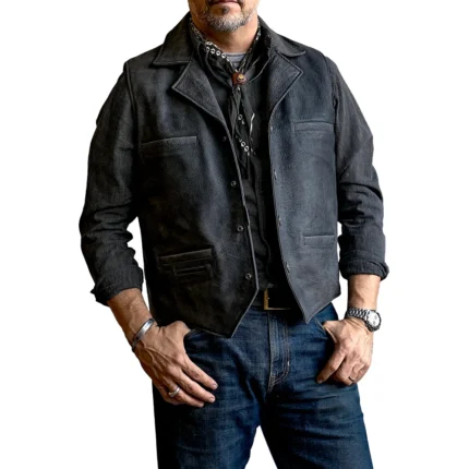 Men’s Black Shearling Leather Jacket with Turn-Down Collar Winter Warm Jacket