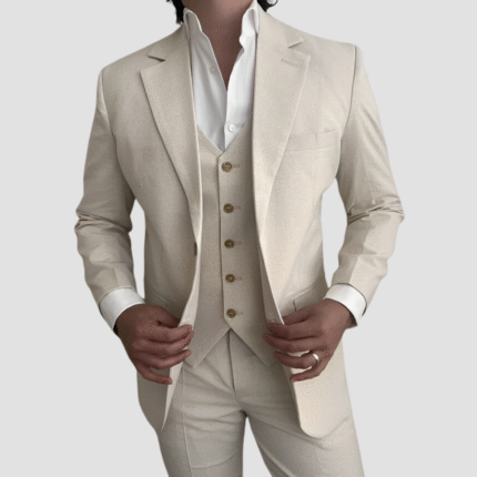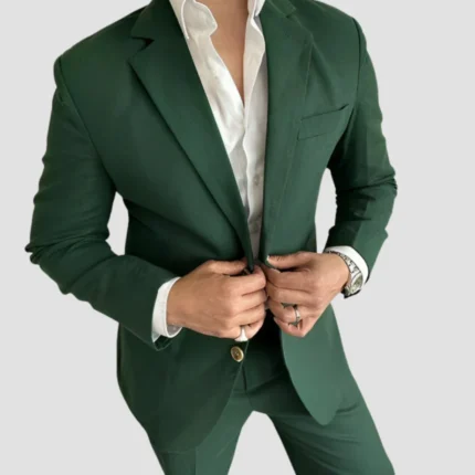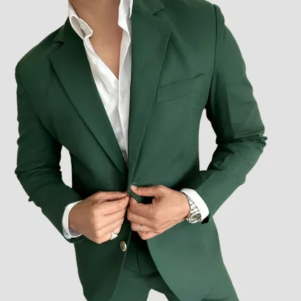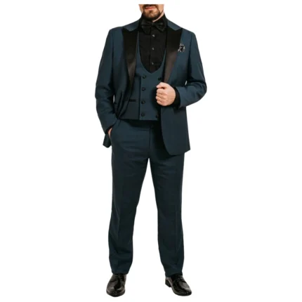 Design: Classic Single breasted suit with peak lapels and a two-button front closure