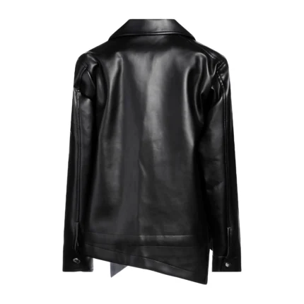 Specification: Material: Grain Texture Leather Color: Black Gender: Female Collar: Notched collar Pocket: Chest flap pockets and side welt pockets Front: Button front closure