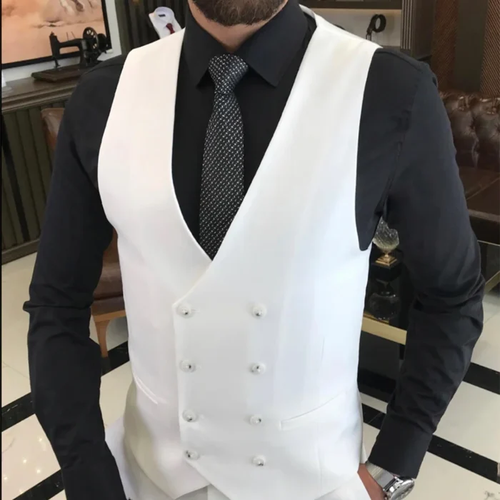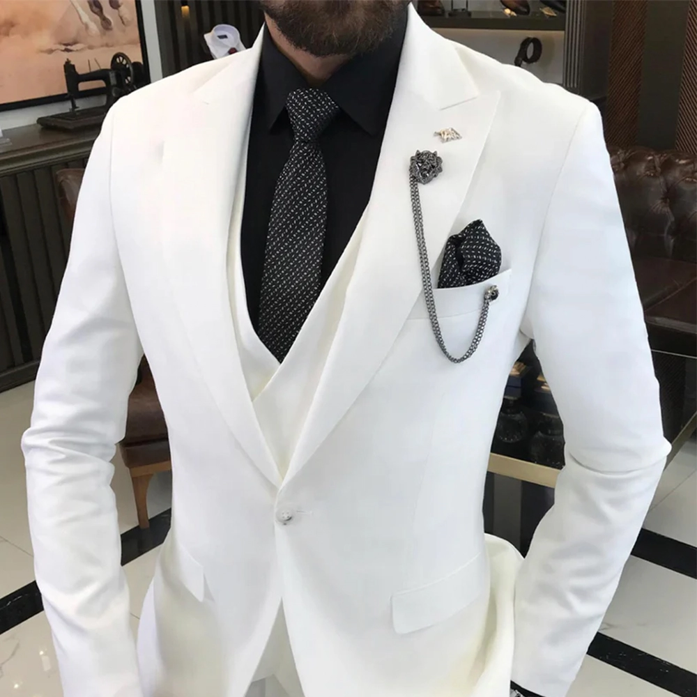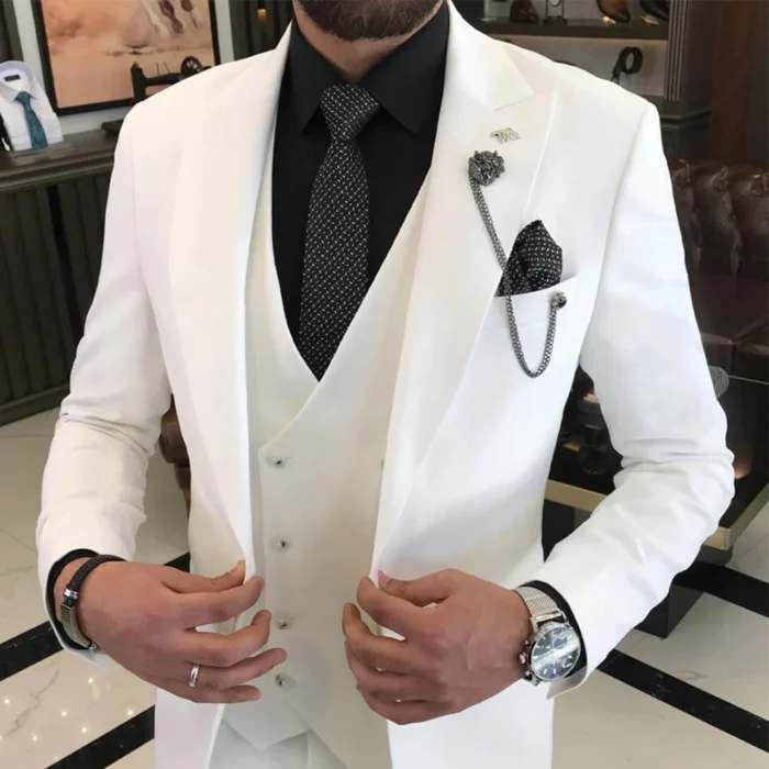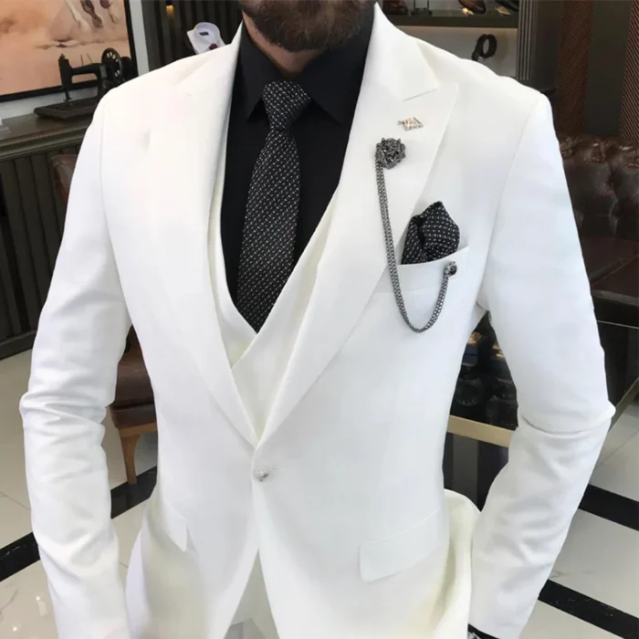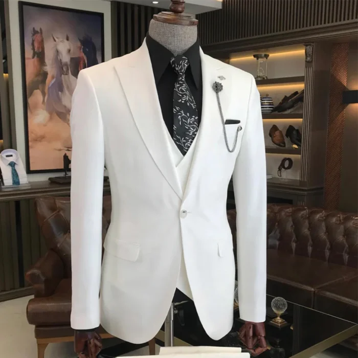 Turn heads in timeless elegance with this Men’s slim-fit 3-piece white suit, ideal for weddings, formal events, or adding a touch of sophistication to your casual outings. The modern slim fit flatters your physique, while the peak lapels on the blazer exude a sharp and confident air. Look distinguished with the double-breasted vest, featuring sleek notch lapels for added depth and dimension. The pants boast a clean flat-front design for a polished finish. Crafted from comfortable and breathable fabric, this suit ensures you look and feel your best throughout the night. Make a lasting impression at your next wedding, prom, or business function with this versatile and impeccably tailored 3-piece white suit.