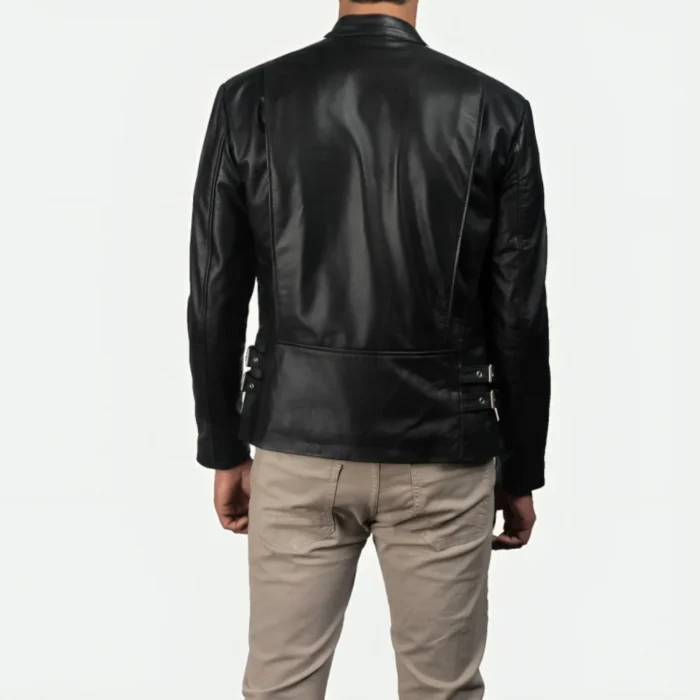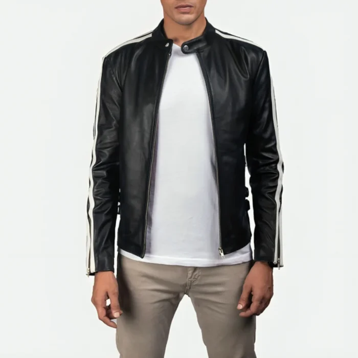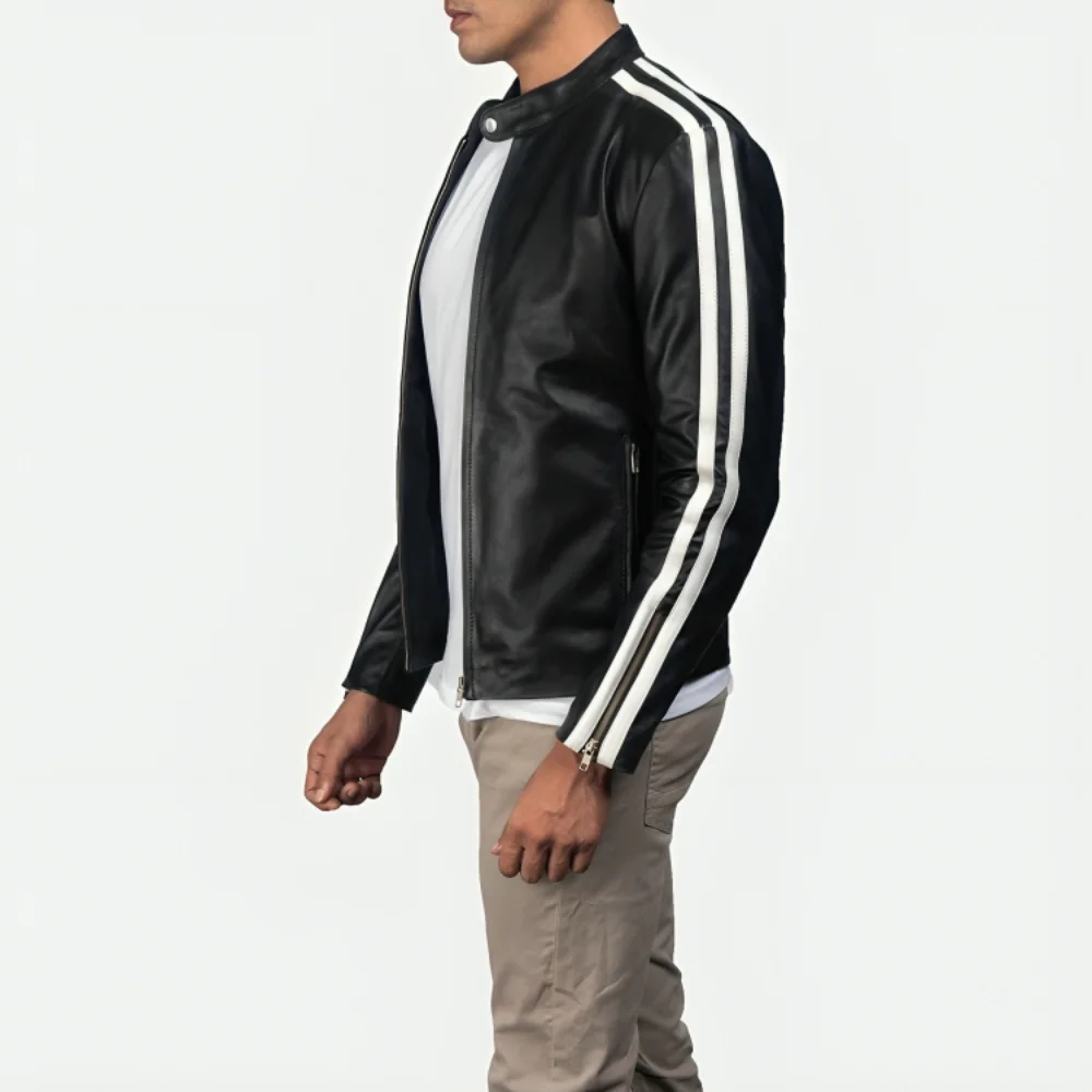 Mens Black Cafe Racer Leather Jacket With White Stripes